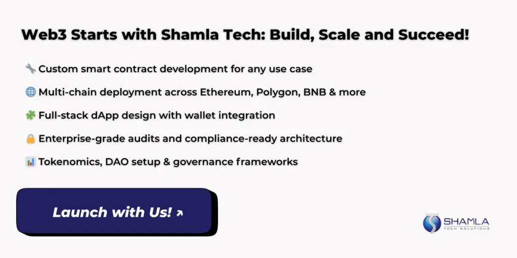 Shamla Tech’s Web3 development services build clear, secure platforms that let you focus on core business goals. By handling smart contracts, node setups, and front-end integration, we help you bring ideas to life without guessing.