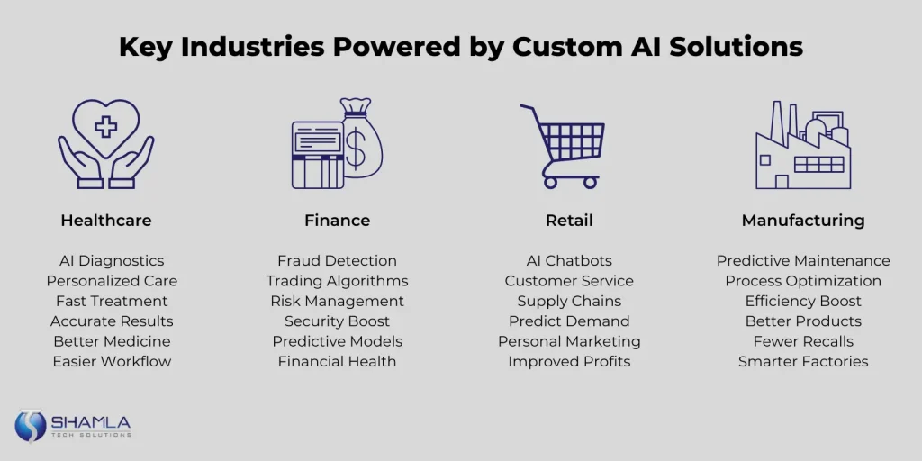 Custom AI solutions play a very important role in solving the unique problems faced by different industries by offering specially made applications that meet the specific needs of each industry. Unlike general AI tools, these custom AI systems are built using data that is specific to the industry, along with expert knowledge, which helps them focus on solving particular problems and improving efficiency in a targeted way.