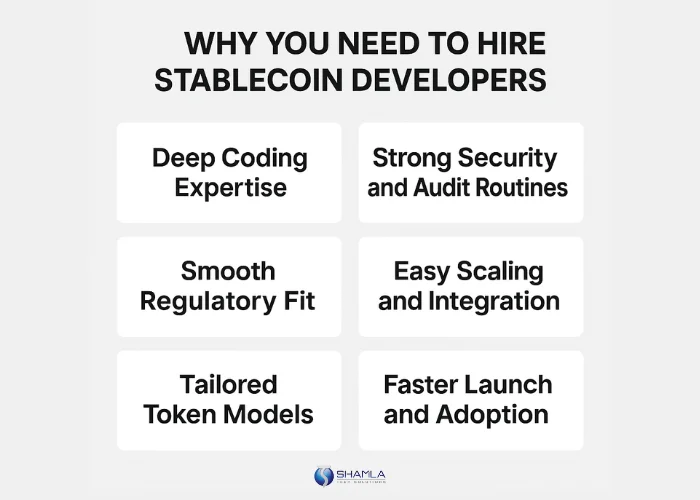 When you hire stablecoin developers, start by picking a reliable tech team or stablecoin development company. Look for firms with a clear process for planning, coding, and testing token logic. A good partner outlines each step, from setting up private nodes to writing mint and burn functions. They share detailed timelines, milestones, and review points. Avoid teams that hide costs or skip audits. Shamla Tech lets you track progress through simple reports and dashboards. By choosing Shamla Tech as your partner helps you cut down missteps and ensure your project moves forward on time and on budget.