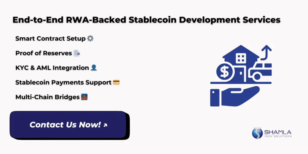 Shamla Tech is a top stablecoin development company that helps businesses build RWA-backed stablecoins. We provide end-to-end solutions, including minting, custody integration, reserve proofs, compliance checks, and multi-chain deployment, enabling firms to launch secure, transparent, and fully auditable RWA-backed stablecoin solutions efficiently.