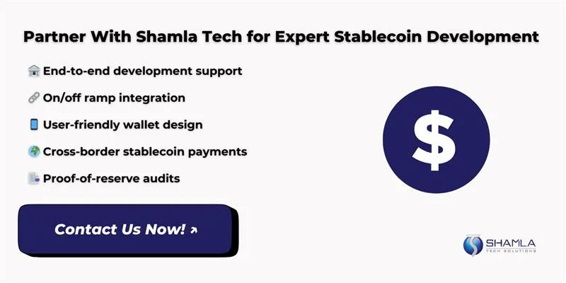 Shamla Tech is a leading stablecoin development company that builds secure rails and wallets for fast payouts. We design end-to-end systems to manage liquidity, compliance, and simple on/off ramps.