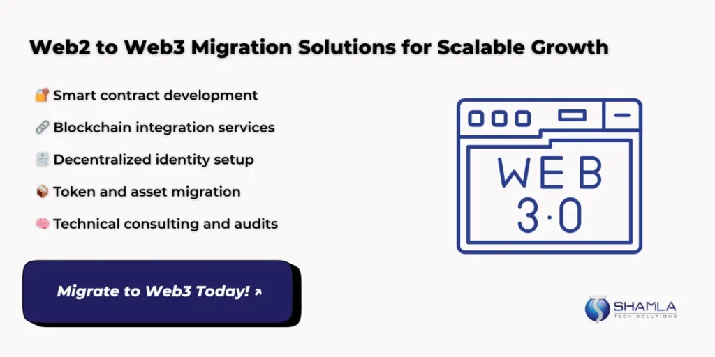 Shamla Tech is a Web3 development company that guides enterprises through secure Web2 to Web3 migration with audited smart contracts, decentralized identity modules, and oracle integrations. Our team configures middleware, API bridges, and sidechain connectors to ensure seamless token transfers and on‑chain data flows. Trust our expertise to deploy robust, scalable, and compliant secure decentralized platforms.